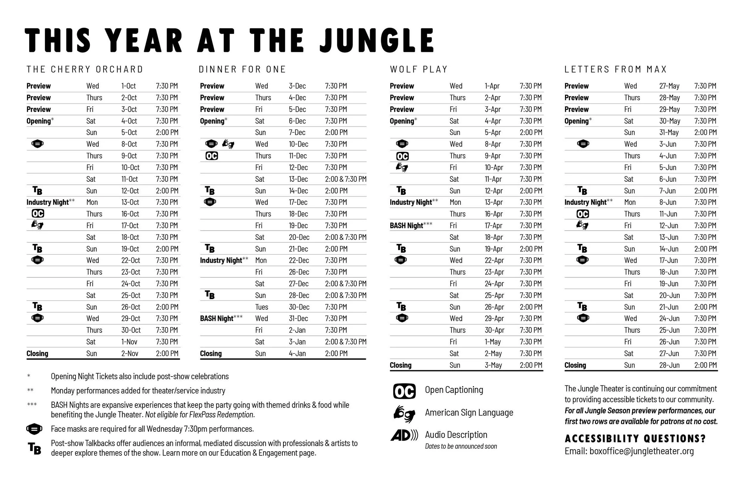 Audio Description and American Sign Language dates as well as Jungle accessibility seating available for both subscription packages. To purchase Audio Description, American Sign Language or accessibility seating season subscriptions please contact the Jungle Theater Artist and Audience Services Manager, Anna Kay.